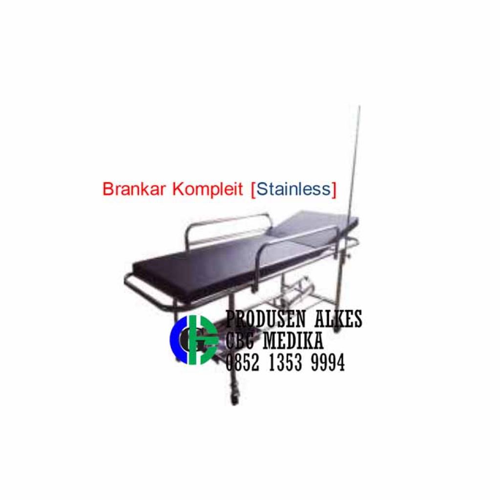 Model brankar kumplit. Lengkap dengan side rail atau alingan tangan disisi kanan dan kiri badan pasien, tempat tabung oksigen dan tempat mesin dibagian bawah. Bahan full stainless steel.